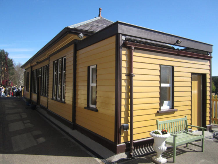 The handsome, wooden, Victorian station building (below) was transported from its former site at Oldmeldrum, where it had survived decades of alternative commercial use.It was reconstructed by RDRPS in 2012/3. Although adapted for modern use on a preserved railway, the building is predominantly formed of its original materials.