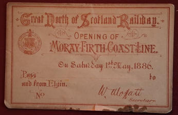 LATEST NEWSItems from the GNSRA shop may be ordered at any time, but - due to holidays - despatch may be delayed until late April 2026.Moray Council now propose to remove the collapsed sections of the Spey Viaduct. According to officers, they will have to be cut up in situ. Cost is estimated to be £500,000.The currently-featured harbour is Fraserburgh Harbour (click here to see).View 26 minutes of stunning colour video(click here) of GNSR trains, stations, etc. taken by David Gordon, Marquess of Aberdeen and Temair in 1963. Courtesy of National Library of Scotland Moving Image ArchiveGNSRA has a privatefacebookpage. Search there for Great North of Scotland Railway Association and apply to join. (Note that we reject those that do not answer membership questions). As of 12th February 2026, we have 362 facebook members.Please report any problems with website to Webmaster - click to send email.The item to the left is a Pass from the opening day (1 May 1886) of the Moray Firth Coast Line.The owner currently wishes to sell and is looking for £90.If anyone is interested at that price, please send an email to webmaster@gnsra.org.uk and I will forward the seller’s details.